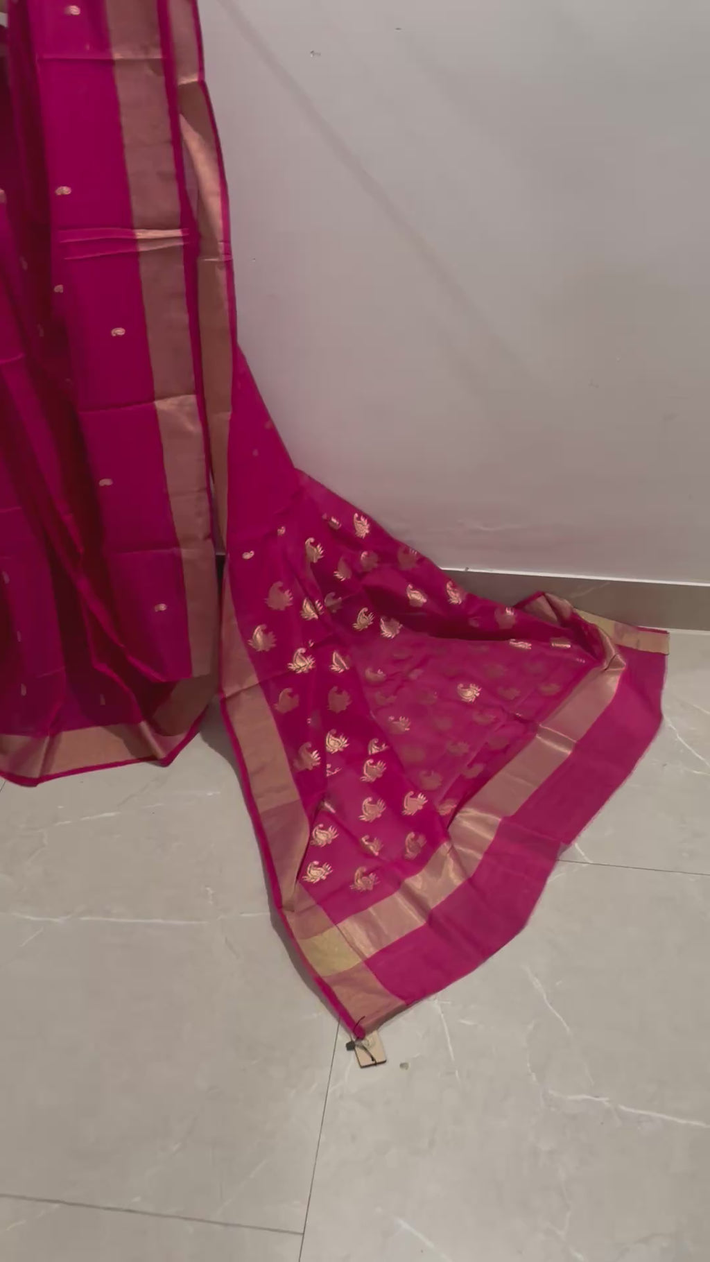Elevate your ethnic wardrobe with this stunning handwoven Chanderi saree that seamlessly blends tradition with contemporary elegance. Crafted in luxurious Dark Pink silk-cotton, this bold statement piece features an exquisite golden zari border that frames the fabric beautifully. The pallu showcases intricate golden motifs adorned with delicate floral patterns, creating a captivating focal point. Perfect for weddings, festivals, and special occasions, this Rani Chanderi saree offers the comfort of breathable fabric with the sophistication of artisanal craftsmanship. Make a striking impression with timeless grace and refined style.